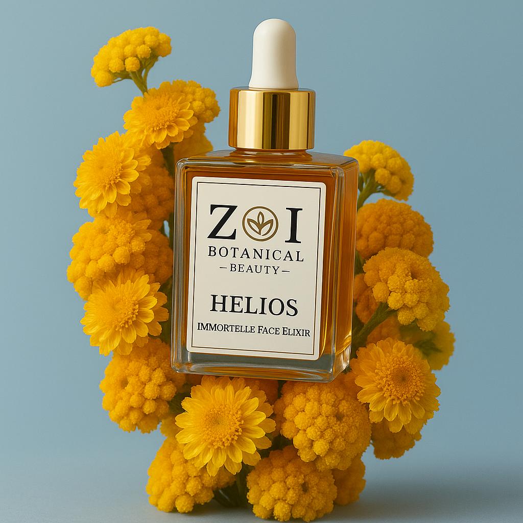 Layered with CO₂-extracted botanicals, antioxidant-rich oils, and vitamins C & E, Helios restores balance, glow, and resilience — drop by golden drop.